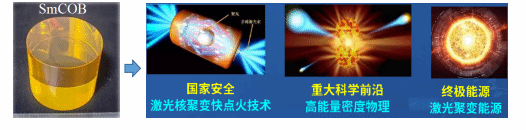 【应用背景】激光朝着更高峰值功率、更高平均功率和更短脉冲方向发展,需要能承受更高功率、转换效率更高、增益带宽更大的飞秒激光放大介质材料。RCOB晶体是这一领域应用的重要晶体,主要包括YCOB、Sm:YCOB、SmCOB、Nd:GdCOB等晶体。其中YCOB晶体是为数不多可用于拍瓦级激光系统的倍频(SHG)和光参量啁啾脉冲放大(OPCPA)的关键晶体材料。Sm:YCOB和SmCOB是一类可用于准参量放大(QPA)技术的新型非线性光学晶体。Nd:GdCOB是一类温度带宽非常大的激光自倍频晶体,适用于在恶劣的冷热环境中不使用控温稳定地产生绿光和黄光激光。【需解决的问题】超强激光中的SHG、OPCPA和QPA等实现大能量输出的关键是保障无宏观缺陷的前提下增大非线性光学晶体的口径,并制备高光学均匀性晶体。【目前进展】本课题组已研制出可应用的大尺寸YCOB和SmCOB晶体。
