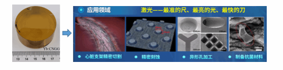 【应用背景】超快激光向更高功率发展,需要发展具有更优激光性能的激光基质新材料。Yb:CNGG晶体具有比Yb:YAG晶体更大的吸收带宽、更快的脉冲时间,熔点更低,成本更低。Yb:CNGG对促进高功率超快激光产生技术发展意义重大。【需解决问题】克服Yb:CNGG晶体开裂和包裹体缺陷的大尺寸晶体生长技术;发展具有更好激光性能的组分优化的石榴石晶体材料。【目前进展】获得最大直径达2英寸的Yb:CNGG晶体。