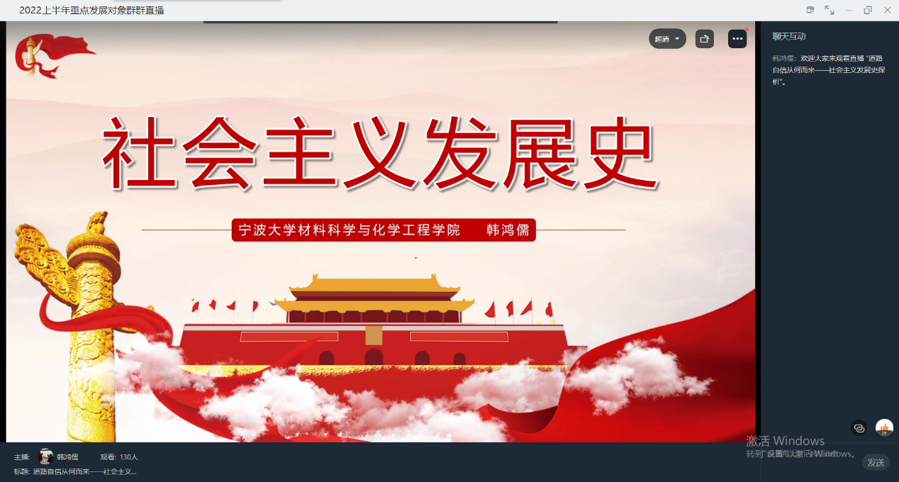 党委委员韩鸿儒于钉钉课堂作“道路自信从何而来——社会主义发展史探析”线上专题党课,学院共140余名分党校学员参加。