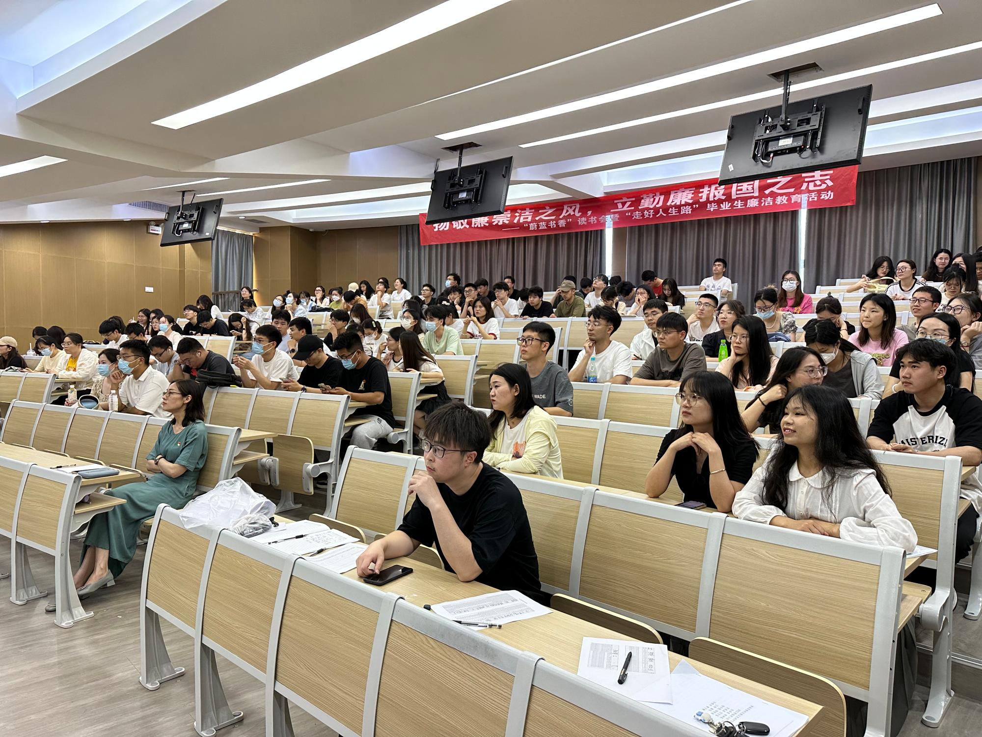 学生党员代表结合自己的实际就如何扣好人生的扣子分享了阅读体会,考上公务员的毕业生代表作出郑重的廉洁承诺。现场气氛热烈庄重,大家纷纷表示,在毕业、从业这一关键节点上,一开始的起步意义重大,要严于律己,选择清正廉洁之路。