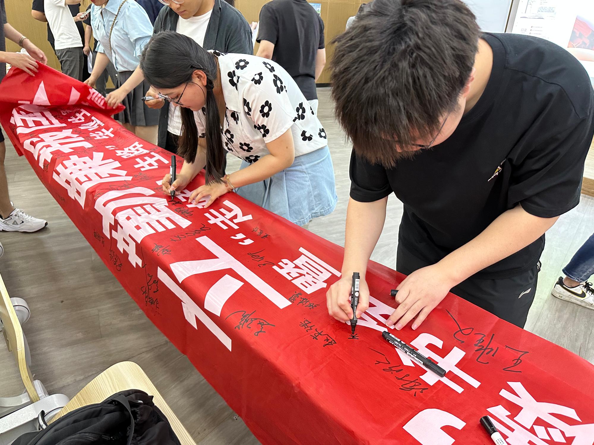 全体毕业生党员们在廉洁从业主题横幅上郑重签字,承诺守住清白底线,廉洁自律、以身作则,充分发挥党员先锋模范带头作用。