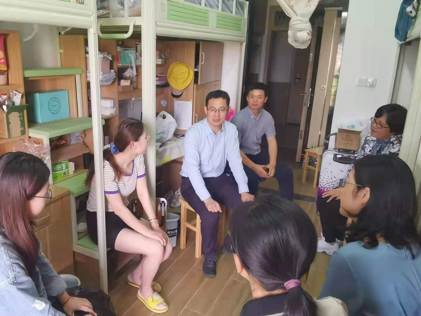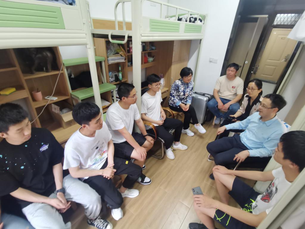 北区学生宿舍,和10多名研究生、本科生亲切交流。校团委书记孙芬娜、副书记姚小斌,保卫处副处王湖清,学院党委书记陈玉涓、副书记朱燕、学工办主任韩鸿儒陪同。