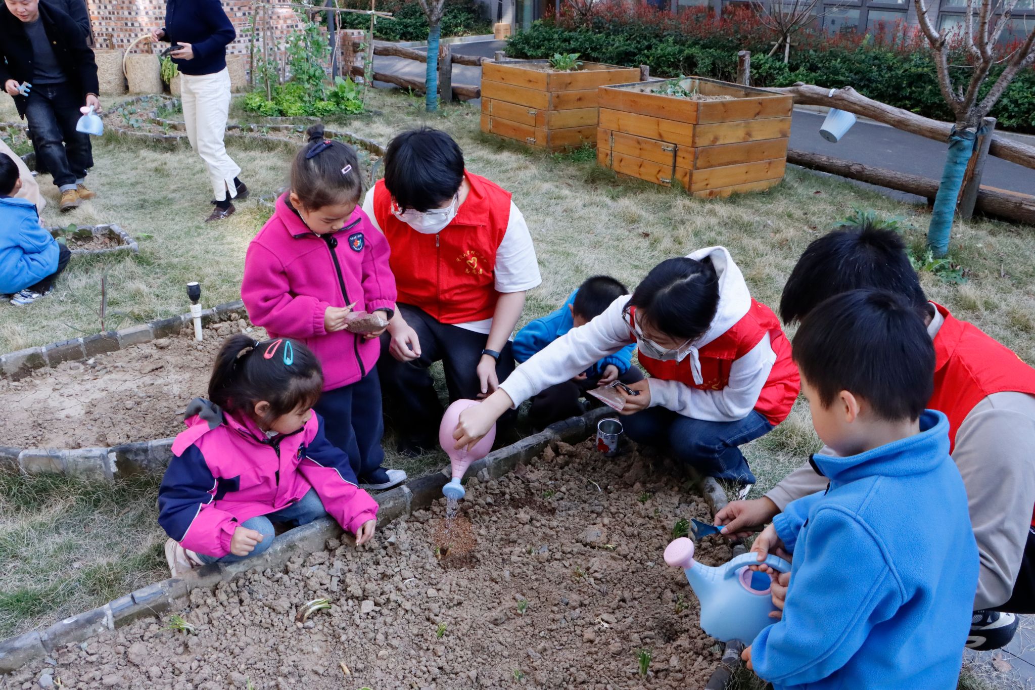 活动首先以一系列有趣的实验揭开序幕,志愿者们为孩子们带来了“梦幻彩虹雨”“彩虹泡泡龙”“大象牙膏”等有趣的绿色小实验,通过日常生活中的常见物品,如小苏打、醋、食用色素等,志愿者们为孩子们展示了奇妙的化学反应。氧气,二氧化碳,水以及其他自然界常见的化学元素在一个个犹如魔法的实验中展现出来,让孩子们惊叹不已。紧接着,在志愿者们的引导下,孩子们还饶有兴致地观看了草莓、圣女果、蓝莓、樱桃萝卜、丹麦风铃花、橘子、四叶草和含羞草的种子以及它们的成株照片。结合“立身正己 不负春光——春分日主题廉洁教育活动”,志愿者们和孩子们共同制作廉洁书签,宣讲廉洁故事,带领孩子们在自己的科普园地亲手种下种子,并施上自制的化肥,“光照、温度、修剪、水分、肥料,是绿植生长发芽的五个关键因素。小朋友们平时还要注意经常转动花盆,让植物接受更均匀的光照,这样才能促进绿植更好的生长,开花和结果。”在老师和志愿者们的谆谆教导下,孩子们化身为春日小精灵,泥土的芬芳与童真的笑语交织成春日最美的乐章。