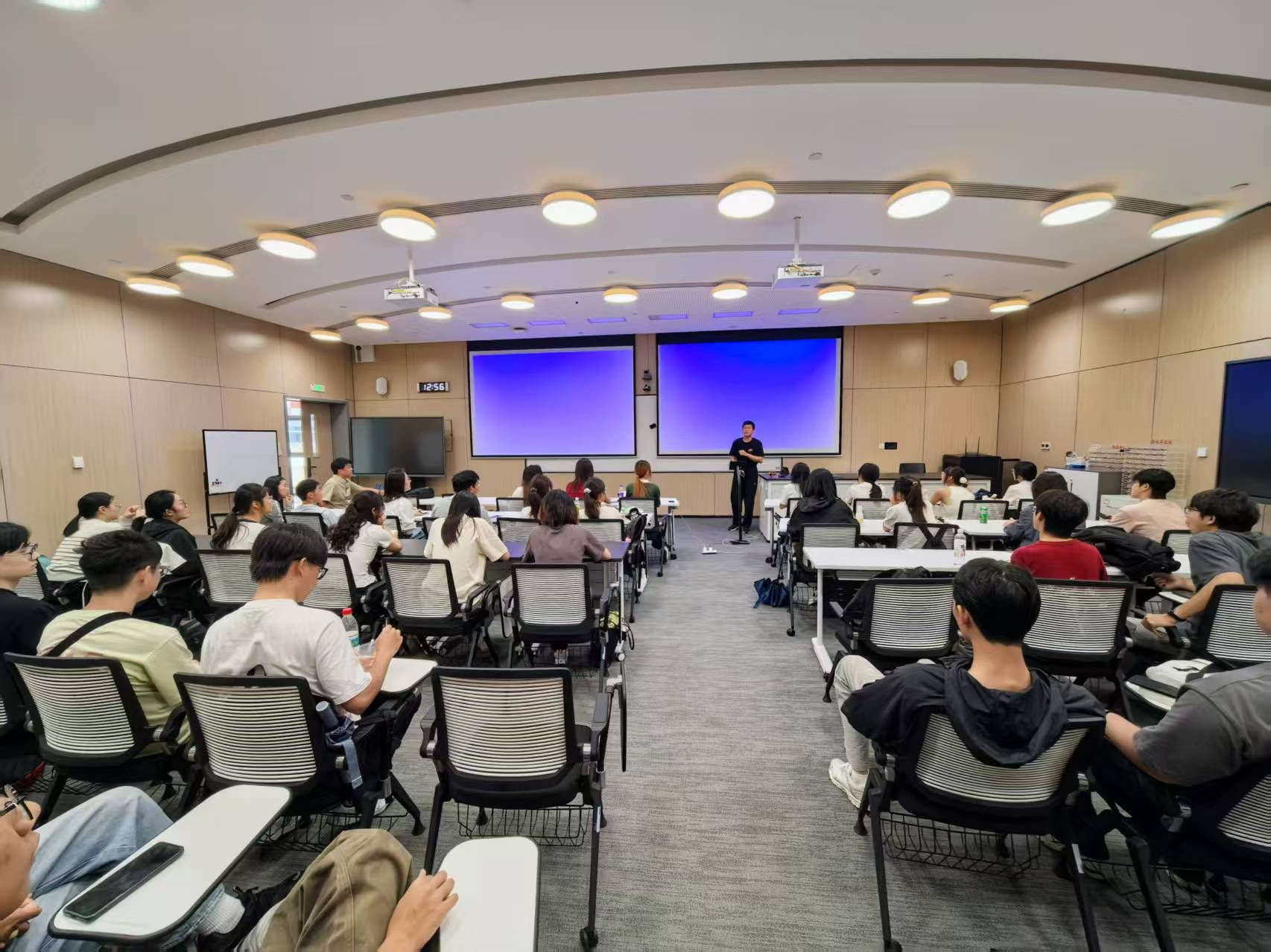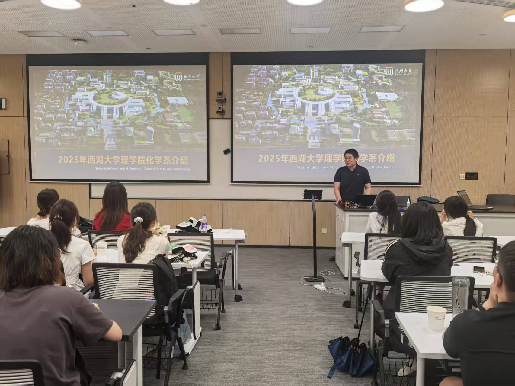 随后,在学院报告厅,西湖大学相关师生系统介绍了西湖大学理学院办学情况。化学系胡鹏飞老师介绍了系里的基本情况和全系老师的研究方向,通过深入浅出地介绍自己两项代表性研究工作全过程,生动展示了他所在课题组的基本情况,并与学院师生代表进行了深入交流。西湖大学理学院在读博士生代表张飞扬向参访师生介绍了什么人适合到西湖大学深造,如何申请到西湖大学深造以及到西湖大学后需要注意什么,从学生视角分享了切身感受。西湖大学化学系主任张鑫老师和赵传壮老师就学科建设、专业发展和人才培养进行了详细深入的交流和研讨。