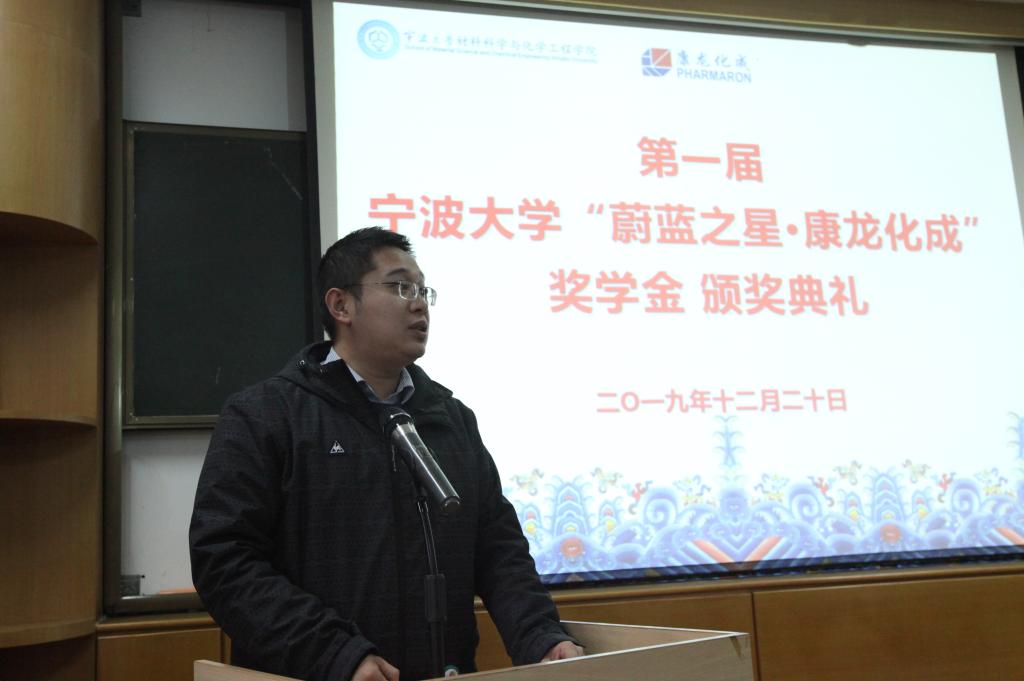典礼上,我校发展联络处副处长姜煜洌向康龙化成新药技术有限公司嘉宾赠送学校礼品表示感谢。典礼最后,付建民博士向在场获奖学生表示祝贺,他讲述了设立康龙化成特色班及奖学金的初衷,讲述了楼柏良博士创业及康龙化成的发展事迹。他勉励在场同学们再接再厉,争取取得更大的成绩,在学校学到的知识应用社会服务中。付博士的发言获得了现场同学的热烈响应。