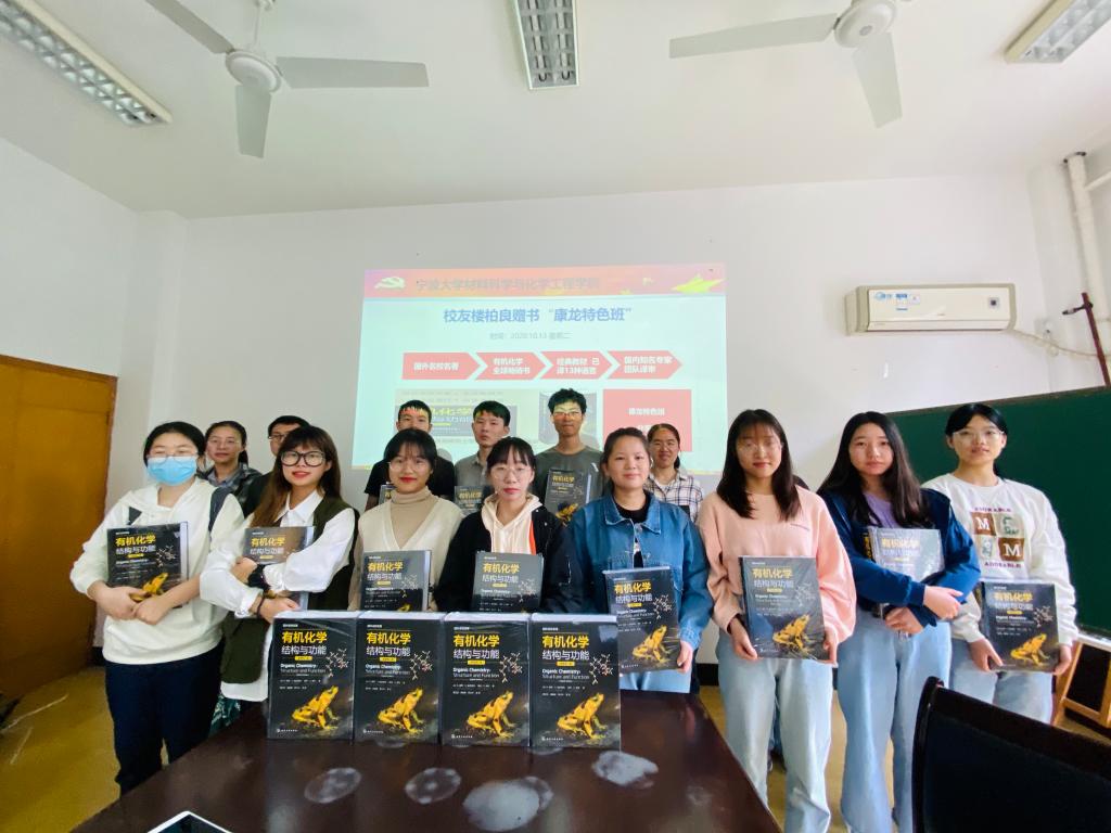 校友楼柏良博士从北京专程寄来《有机化学:结构与功能》全球畅销书,赠送给学院第一、第二届全体“康龙特色班”的同学们。赠书活动会上,学院学生工作负责人介绍了该书籍在化学领域的巨大影响力,希望同学们不辜负校友的殷切期望,充分发挥该书在学习和考研中的作用,为推动行业更好发展而努力。随后,开展了康龙特色班学习科研座谈会,学生分享了近期取得成绩和下阶段的努力方向。