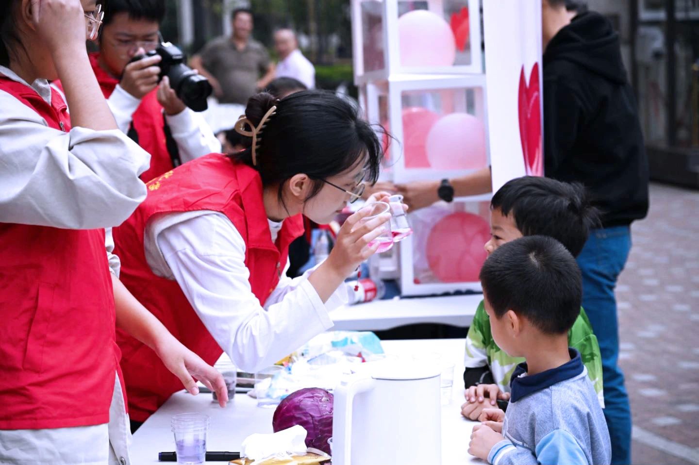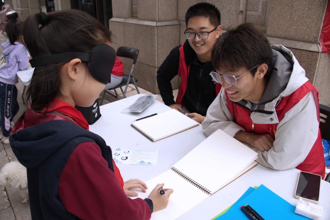 志愿者们来到海曙区南门街道红起社区,以打卡集章的方式开展“盲人体验”游戏及知识科普活动。志愿者们带领小朋友从“体验盲文”到“蒙眼作画”,再到“蒙眼闻物”,全真模拟盲人世界,全程蒙眼感受盲人的文字,仅凭对事物的想象画出物体,用嗅觉区分生活中常见的醋、酒精、白开水。蔚蓝“小菜花”科普团立足于专业特色,设计了“缤纷世界”变色趣味科学实验。志愿者们拿出生活中常见的紫甘蓝、柠檬、白醋、小苏打、白糖等材料,带着小朋友们将紫甘蓝汁分别倒入糖水、苏打水、柠檬水、白醋和白开水中,原本无色的液体,变成了蓝色、粉红色和紫色,小朋友们在五彩缤纷的色彩变化中,感受到明亮世界的美丽,增强保护视力、爱护眼睛的健康意识。
