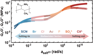 赵传壮课题组近期将Hofmeister效应和高分子物理中经典的“时温等效原理”结合起来,提出了“时盐等效原理”,用以诠释聚甲基丙烯酰胺(PMAm)水凝胶的粘弹性随着外加盐类型的剧烈转变的现象。该工作揭示了时盐等效性的物理起源——聚合物-水-盐三元相互作用,验证了概念的普适性,并基于这一概念探索了水凝胶的功能盐调控和盐加工的可能性。