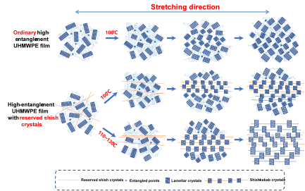 超高分子量聚乙烯(UHMWPE)数以百万计分子量的柔性长链结构易相互穿插,形成大量缠结,阻碍分子链的运动,影响UHMWPE的聚集态结构,对UHMWPE制品的各项性能产生很大影响。基于团队之前的研究,本论文在熔融加工成型过程中通过调控成型温度将UHMWPE树脂中的shish晶体保留至高缠结UHMWPE薄膜中,成功制备得到保留shish晶体的高缠结UHMWPE薄膜。利用上海同步辐射光源的原位SAXS/USAXS/WAXD对薄膜热拉伸过程的结构演变进行研究,发现shish晶体的引入有利于减少由高缠结导致的倾斜片晶堆积,促进倾斜片晶向shish-kebab晶体转变。而且高温拉伸时,分子链可以进一步解缠结,有利于分子链的结晶和取向,促进更多shish-kebab晶体的形成。本研究不仅可以加深对shish-kebab晶体形成与演变机理的理解,而且为工业化和商用的高缠结UHMWPE产品加工以及性能提高提供了新思路。