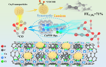 利用以绿电为动力的电催化还原CO2反应,将CO2高活性、高选择性转化为C2H4具有重要的科学意义和工业应用前景。目前,电催化还原CO2制C2H4已经取得了一些进展,但其C2H4收率还远低于传统的热催化CO2加氢反应。因此,设计和制备高效电催化剂,实现高电流密度、高C2H4选择性、高稳定性的“三高”性能,是推进电催化还原CO2走向实际应用的关键。本研究基于协同-串联策略,以含双活性位点Cu基卟啉有机框架CuPOF-Bpy@CNT和Cu2O纳米颗粒为组分构建了一例串联催化剂CuPOF-Bpy/Cu2O@CNT。该催化剂在H型电解池和具有气体扩散电极的流动池中都表现出优异的电催化活性,C2H4产物的法拉第效率高达71%,催化剂在长时间测试过程中仍保持稳定,整体性能表现出实际应用潜力。原位光谱和理论计算表明CuPOF-Bpy中双活性位点产生的高浓度*CO易脱附并迁移到Cu2O表面,定向转化为关键中间体*COCOH,最终高选择性生成C2H4。该研究为开发高效稳定的CO2-to-C2H4电催化剂提供了新的思路。