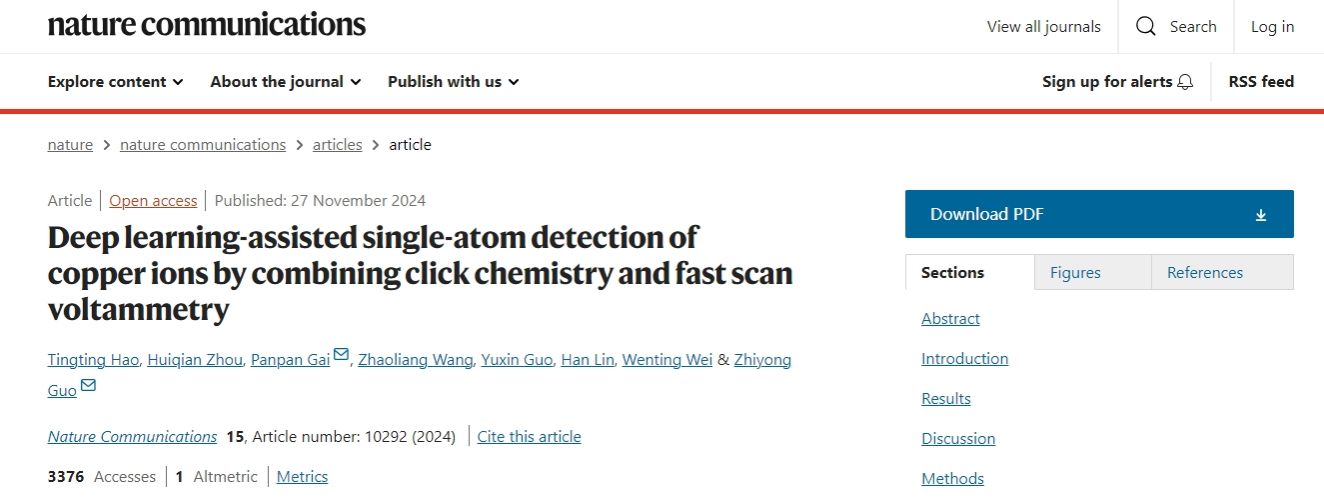 郭智勇科研团队在《自然》期刊子刊《Nature Communications》上发表了题为“Deep learning-assisted single-atom detection of copper ions by combining click chemistry and fast scan voltammetry”(深度学习辅助快速扫描伏安法检测单原子铜)的高水平研究论文。该研究首次实现了铜离子的单原子检测,为分析化学和生命科学领域提供了全新的研究思路。郝婷婷博士和研究生周会茜为共同第一作者,郭智勇教授和盖盼盼教授为共同通讯作者,玩偶姐姐