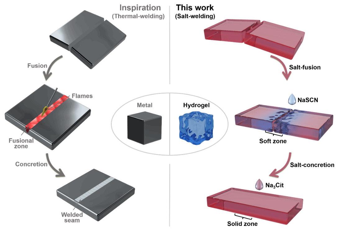 的研究者发现了一类高分子水凝胶具有“时盐等效”现象(Macromolecules 2024, 57, 2746),它的分子在某些盐的作用下可以加速运动使得材料变得像水一样柔软,在某些盐的作用下又可以凝聚起来使得材料变得像塑料一样坚硬。基于此,研究团队提出了“盐焊接水凝胶”,仅需在室温下的盐溶液中简单浸泡95分钟,就使得水凝胶恢复了23 MPa的断裂强度,超越了同类型材料的修复速率。相关成果发表在Science Advances(Science Advances 2025, 11, eadr9834)。