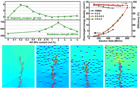 大功率储能装置由于其高功率输出能力,近年来在先进武器装备、超高压直流输电系统和电动汽车中引起了广泛关注。然而,击穿强度(Eb)和极化(P)之间相互制约,严重限制了介质电容器储能密度的进一步增加。为了克服这一困境,多层结构纳米复合材料已被认为是打破Eb和P平衡的最有效方法之一,其包括具有高负载填料(>10 vol.%)的极化层和具有相对较低负载的填料(≤ 5 vol%)的击穿强度层。不幸的是,具有高负载填料的多层纳米复合膜将导致其机械性能(如弹性、耐久性和强度)降低,并使膜的加工复杂化。在具有低纳米填料负载的层状复合材料中平衡Eb和P是一个巨大的挑战。在此,该团队打破传统的设计思路,通过超低纳米填料负载量的多层聚合物纳米复合材料(0.2 vol%作为极化层、2 vol%作为击穿层)提高储能性能。通过实验和理论计算表明,新设计的多层纳米复合材料的放电能量密度大幅度提高,其中储能密度为25.1 J/cm3及充放电效率93.8%。 该项工作为设计聚合物基复合膜的应用提供了新的机会,有望成为紧凑型和小型化电容储能器件的候选材料之一。