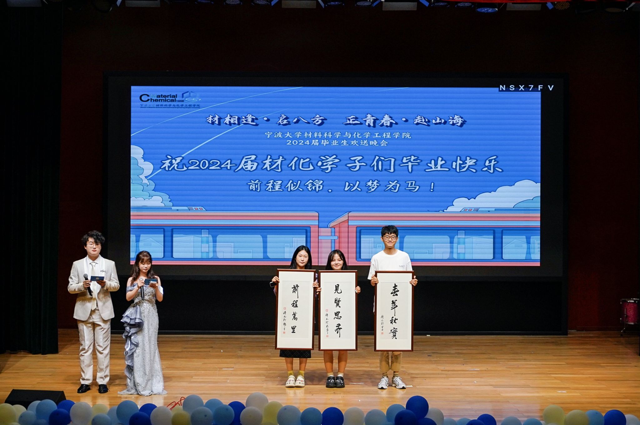 欢送晚会的表演以“思忆、青春、感动”为主要基调,分为《材相逢》《启八方》《正青春》《赴山海》四个篇章,既有饱含情感的歌曲演唱,也有活泼灵动的舞蹈,还有颇具专业特色的情景剧以及幽默诙谐的相声表演、热烈深情的乐器演奏等,别出心裁的表演形式带给了全场师生一场美轮美奂的视听盛宴。现场既有欢声笑语,也有热泪盈眶,大家共同缅怀青葱校园岁月,感恩师长教导。丁传凡现场赠送给毕业生代表们“春华秋实”“见贤思齐”“前程万里”三幅亲手写就的墨宝,鼓励毕业生们勤耕不辍、奋发向上,饱含着师长对毕业生们殷切的祝福、关怀和期待。