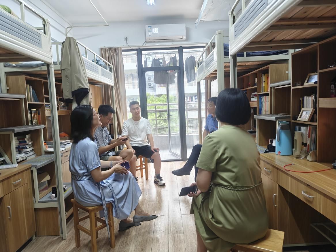 在研究生寝室,学院领导们与研究生们亲切交谈,了解科研进展、生活需求和就业意向,特别叮嘱大家注意实验室和寝室安全,合理安排暑期留宿时间。