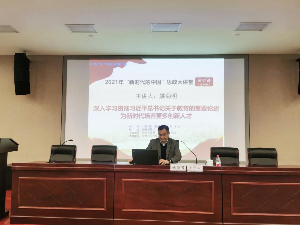 最后,姚菊明结合习近平总书记在中国科技院第十九次院士大会、中国工程院第十四次院士大会上的讲话,进一步强调了人才是第一资源,创新是第一动力。希望同学们在未来科技创新过程中要有“功成不必在我”的精神担当,胸怀祖国,努力成为堪当民族复兴重任的时代新人。