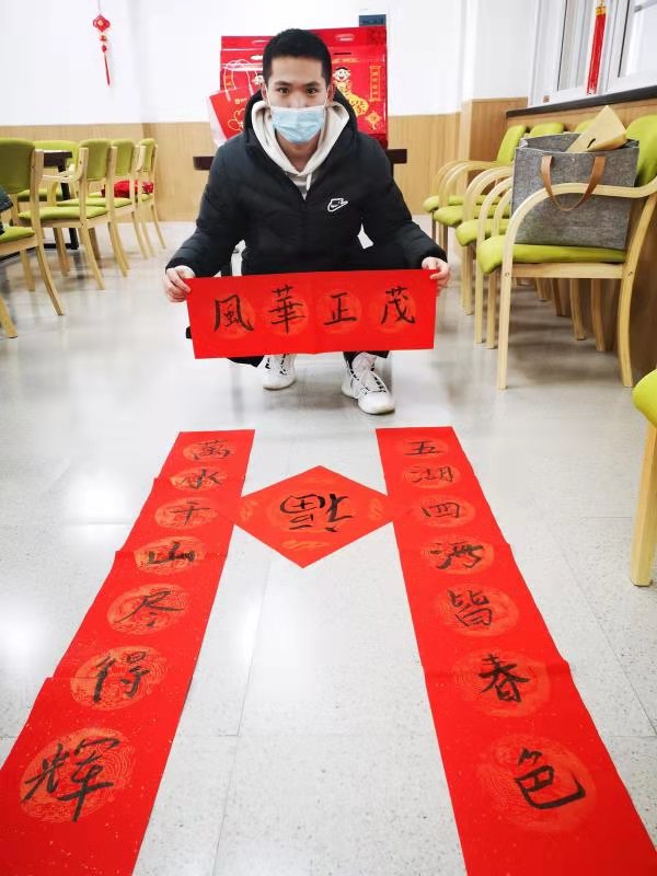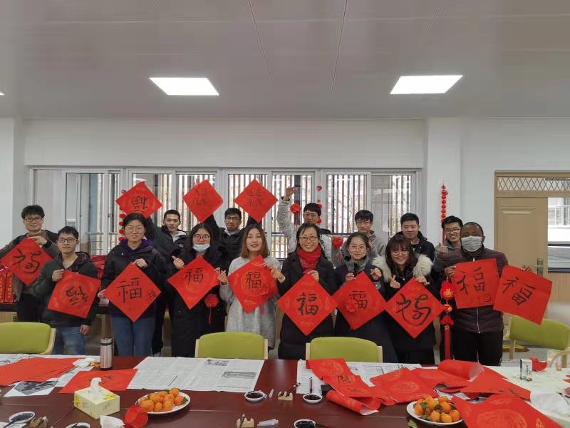 一开始写“福”字时,由于很久没有写毛笔字,同学们还有些放不开。随着慢慢练习,大家兴致越来越高,把对新一年的美好祝愿寄托在自创对联中,纷纷用毛笔写下来,如“上联:做实验皆呈阳性,下联:发文章每投必中,横批:心想事成”“上联:年年岁岁不脱发,下联:朝朝暮暮有钱花,横批:要啥有啥”“上联:五湖四海皆春色,下联:万水千山尽得辉,横批:风华正茂”。每天钻实验室的理工科同学,创作的对联不但接地气,更是妙趣横生,体现了浓浓的年味。