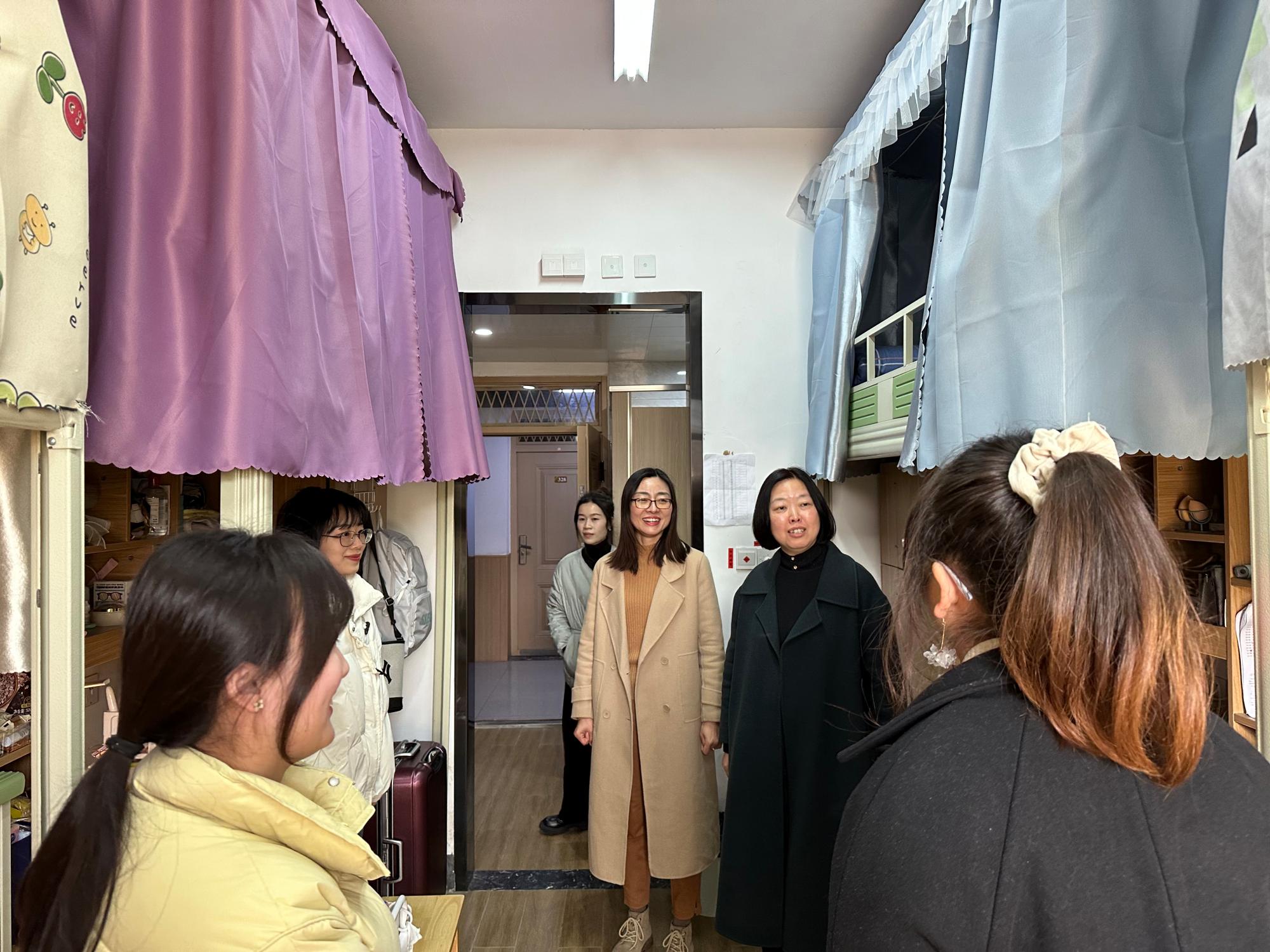 学生寝室,看望慰问返校学生,实地了解同学们的报到和学习情况,为同学们送去温暖的关心和问候。