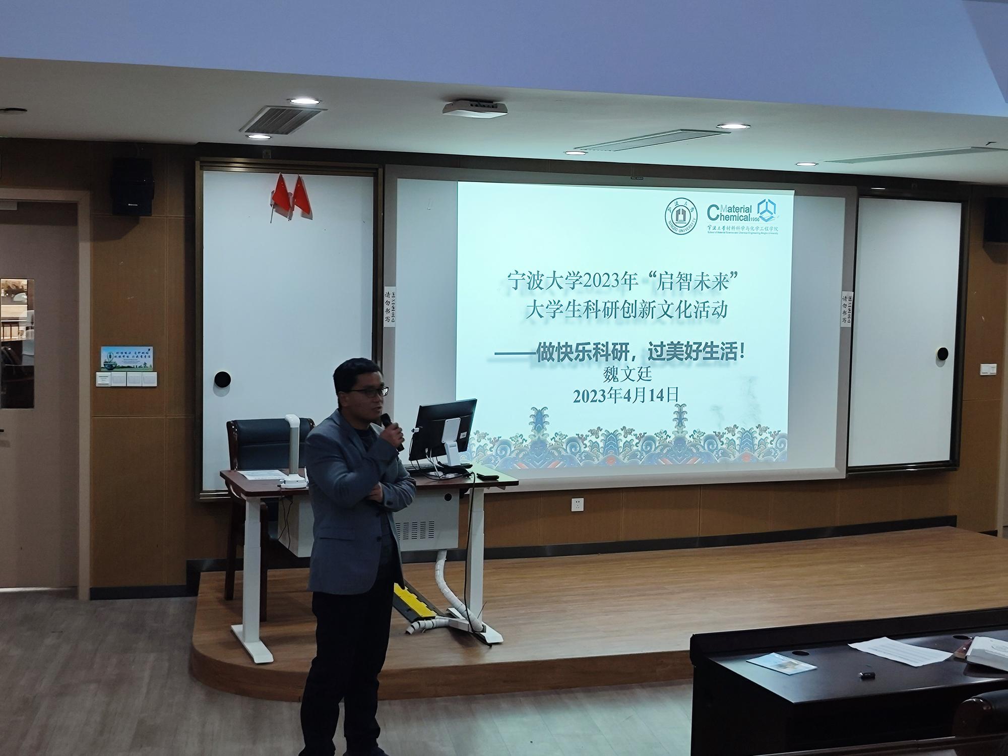 交流会上,魏文廷老师以“做快乐科研,过美好生活〞为主题,向同学们详细介绍了做科研的一般程序,第一步了解学科前沿,注重沟通,选择科研方向和课题;第二步阅读文献收集信息,提出科研思路与方案;第三步学会从模仿到创造,开展实验设计和实施。随后,魏文廷以课题组本科生事迹为例详细介绍了本科生阶段可参与的科研创新项目,鼓励同学们培养好奇心,勇敢尝试,积极投身于科研创新活动之中。