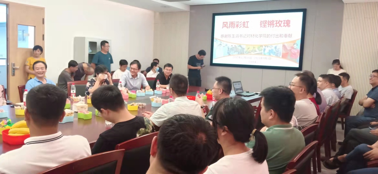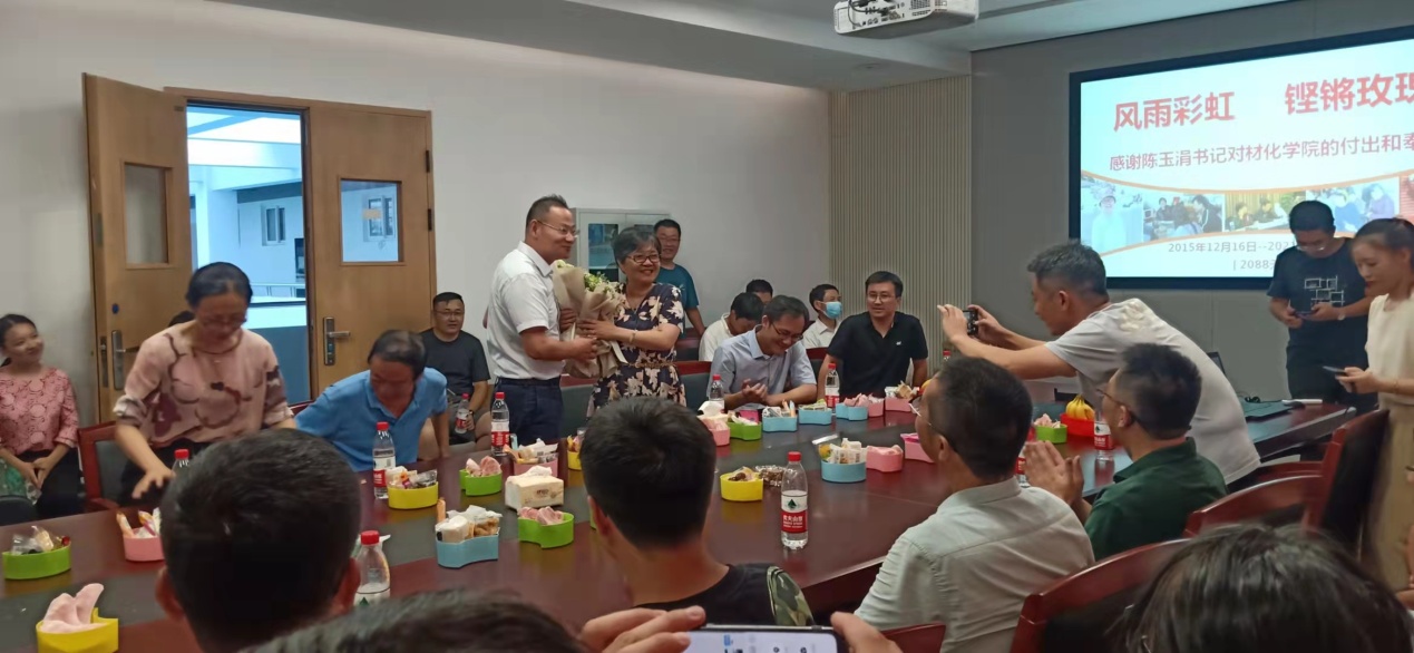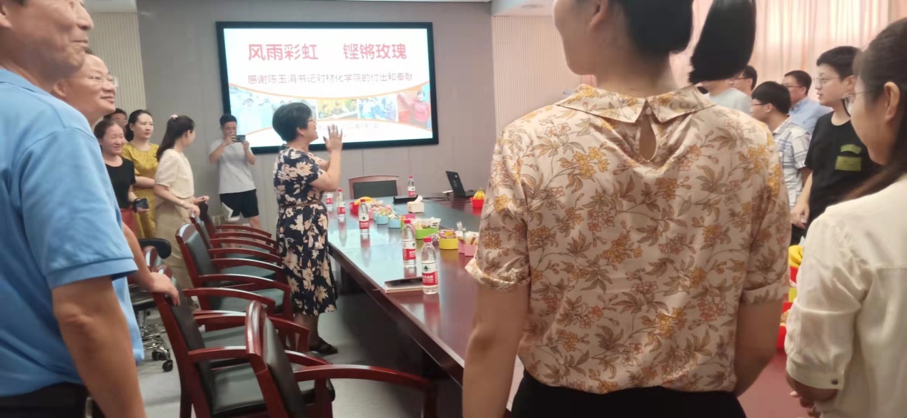 下午三点不到,学院227会议室来了很多人。当陈玉涓出现在会议室门口时,大家与她亲切相拥合影。工会副主席毕文超主持了欢送仪式。首先是播放主题为“风雨彩虹、铿锵玫瑰”的VCR回顾陈书记在玩偶姐姐