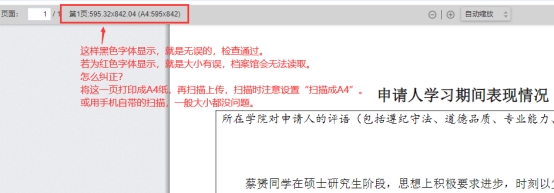 6、附件2或3中的申请人学习期间表现情况 该页自己写好内容后由导师签字,然后扫描成PDF版(备注:扫描的PDF应该是常规的A4纸大小,即分辨率为595*842,太大或太小都无法生成档案,请留意),在网上办事大厅-档案管理-上传附件-学习期间表现情况上传PDF版。具体见档案管理操作流程附件5,请务必按照要求来,以免上传错导致档案出错。