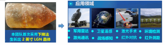 【应用背景】中红外(3~8 μm)波段激光具有很多重要应用,受激光基质(用于激光产生)和非线性光学晶体(用于激光波长转换)限制,现有中红外激光功率仍较低,需发展能承受更高激光功率的非线性光学晶体。LGN晶体比现有商用中红外非线性光学晶体抗激光损伤阈值高,在红外范围内具有最大达7.4 μm的宽带透过,利用差频产生(DFG)技术已经实现了3~7 μm可调谐的中红外输出。【需解决的问题】低成本高品质大尺寸LGN晶体生长技术;具有更高非线性光学系数的晶体组分探索。【目前进展】采用下降法生长出直径2英寸LGN晶体。