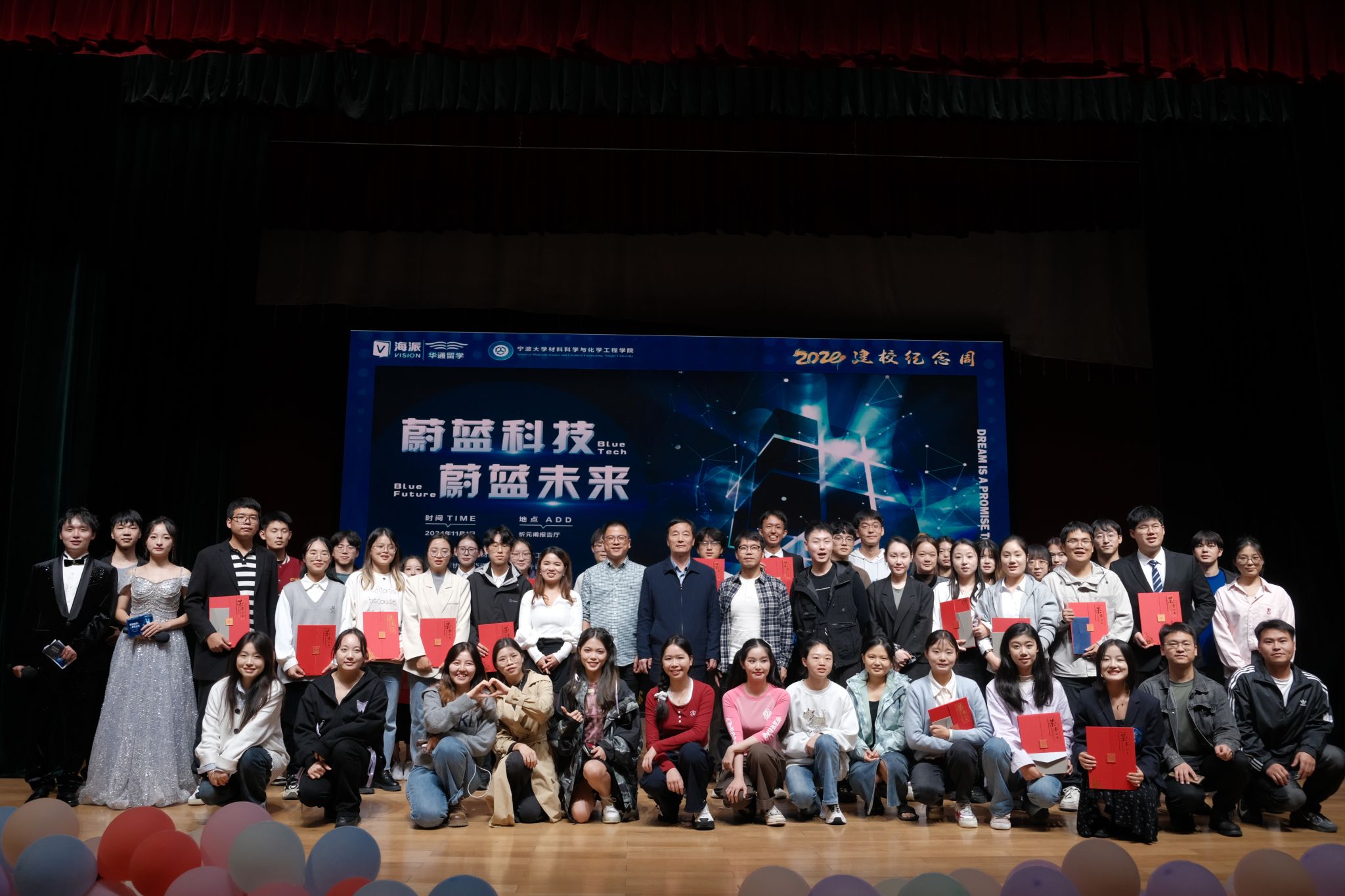 On the occasion of the 38th anniversary of the founding of Ningbo University and the 28th anniversary of the merger of three schools, the College of Materials and Chemical Engineering held the fifth "Blue Tech · Blue Future" Academic English Speech Contest at the Xin Yuanfu Lecture Hall in the North Campus at 18:30 on November 1st. Dean Ding Chuanfan, distinguished alumnus Zhuang Huiqiang, Professor Zhang Zhenxin, teachers Kelly, Blaine, Kyra from Huatong Haipai, Ying Chenxiao, as well as counselors Han Hongru and Yao Yuyang attended and served as judges.